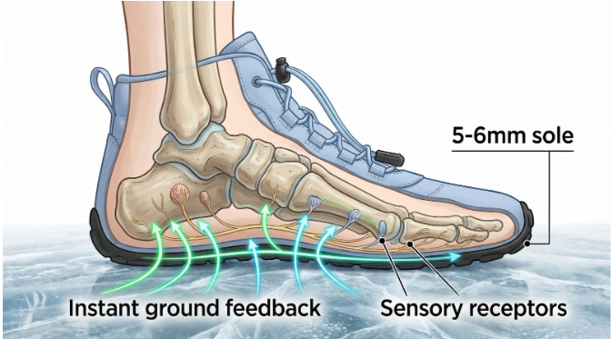 The thin sole (only 5-6mm) gives instant sensory feedback. The moment your foot touches ice or slippery ground, your body knows it, and reacts instantly.
