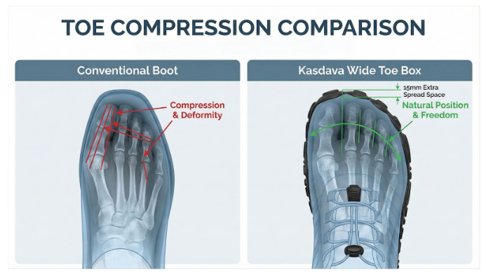 The wide toe box allows your toes to spread up to 15mm more than conventional boots.